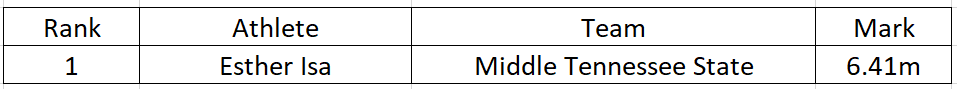 In the Women’s Jump events, Ruth Usoro led the way in both Long Jump and Triple Jump. Her top long jump of 6.87m was a personal best and a World Championship qualifier in Budapest later this year. It was also the 12th farthest long jump in the world during the indoor season. In the triple jump, she jump 14.09m which is the 18th farthest jump in the world this season. Esther Isa of Middle Tennessee State University had the top mark in the indoor High Jump with a jump of 1.84m.