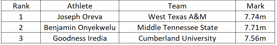 In the Men’s Jump events, Best Erhire of Texas Tech University was the best triple jumper and high jumper with marks of 16.01m and 2.23m. Joseph Oreva of West Texas A&M University was Nigeria’s top men’s indoor long jumper with a personal best of 7.74m.